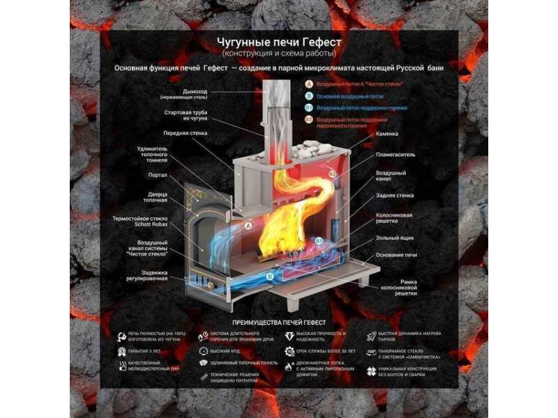 Чугунные банные печи ГЕФЕСТ изготовлены из легированного чугуна с толщиной деталей до 50 мм. Отличие модели «ГЕФЕСТ ЗК» от других серий ГЕФЕСТ — в усиленной каменке большой массы, с единым углублением внутрь топки для дополнительной укладки чугунного заряда. Теплосъемные шипы со стороны горения пламени в разы увеличивают площадь соприкосновения огня с каменкой и ускоряют передачу тепла, а также способствуют лучшему дожигу. Эти усовершенствования значительно повышают мощность парообразования печи «ГЕФЕСТ-ЗК» и выдают большее количество пара при непрерывной поддаче воды. Толщина стенок от 10 до 50 мм делает печь Гефест самой надежной среди чугунных печей, а получаемая масса печи аккумулирует большое количество тепла, позволяет даже при потухшем пламени еще длительное время наслаждаться банными процедурами и существенно снижает расход дров по сравнению с железными печами. Заряд в такой каменке нагревается свыше 500 ⁰С — только с такой температурой получается легкий мелкодисперсный пар, что крайне важно для создания в парной режима «Русская баня». Конвекционные ребра на боковых стенках увеличивают теплопередачу от горящих дров к воздуху в парном помещении. За счет этого печь, несмотря на значительную толщину и массу, быстро выводит парную в требуемый режим.