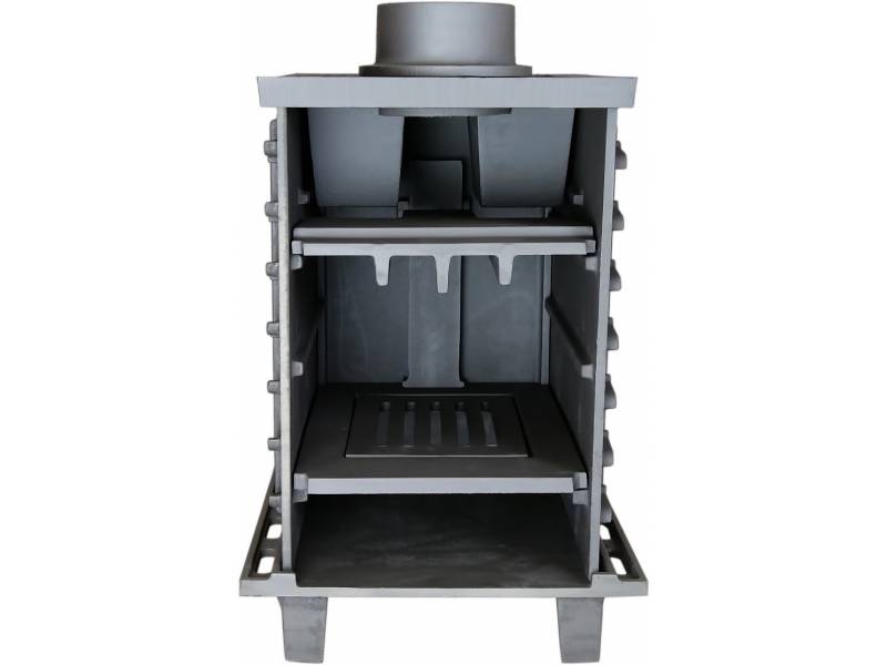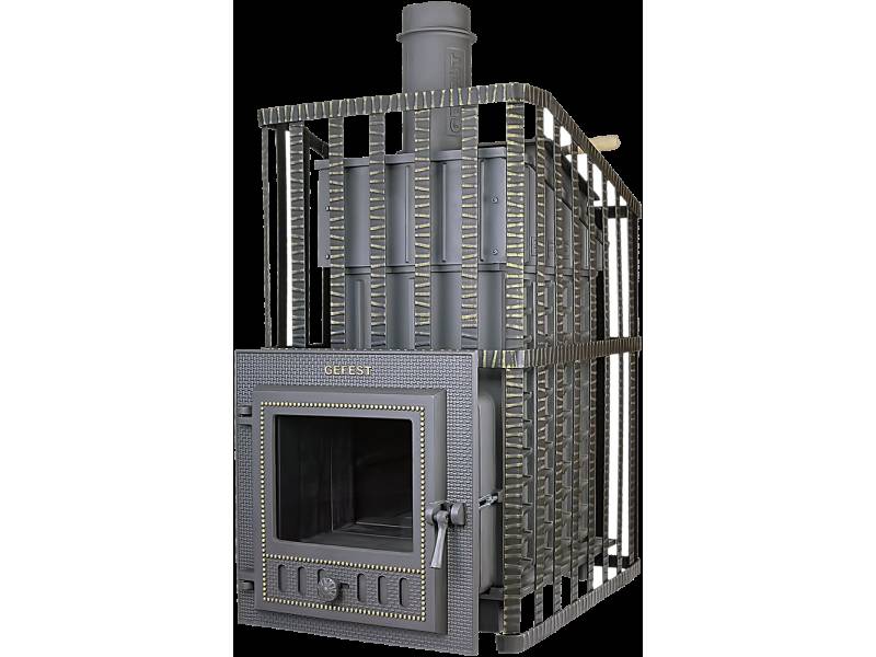 Печь имеет полностью закрытую каменку. Одно из преимуществ печей «Гефест ЗК Ураган» — возможность модернизации за счет установки каменной облицовки, которая существенно упрощает создание режима «Русская баня». Замена сетки на облицовку проводится крайне быстро, без демонтажа печи и дымоходной системы. Толщина стенок от 10 до 50 мм делает печь Гефест самой надежной среди чугунных печей, а получаемая масса печи аккумулирует большое количество тепла, позволяет даже при потухшем пламени еще длительное время наслаждаться банными процедурами и существенно снижает расход дров по сравнению с железными печами. Заряд в такой каменке нагревается свыше 500 ⁰С — только с такой температурой получается легкий мелкодисперсный пар, что крайне важно для создания в парной режима «Русская баня». Конвекционные ребра на боковых стенках увеличивают теплопередачу от горящих дров к воздуху в парном помещении. За счет этого печь, несмотря на значительную толщину и массу, быстро выводит парную в требуемый режим.