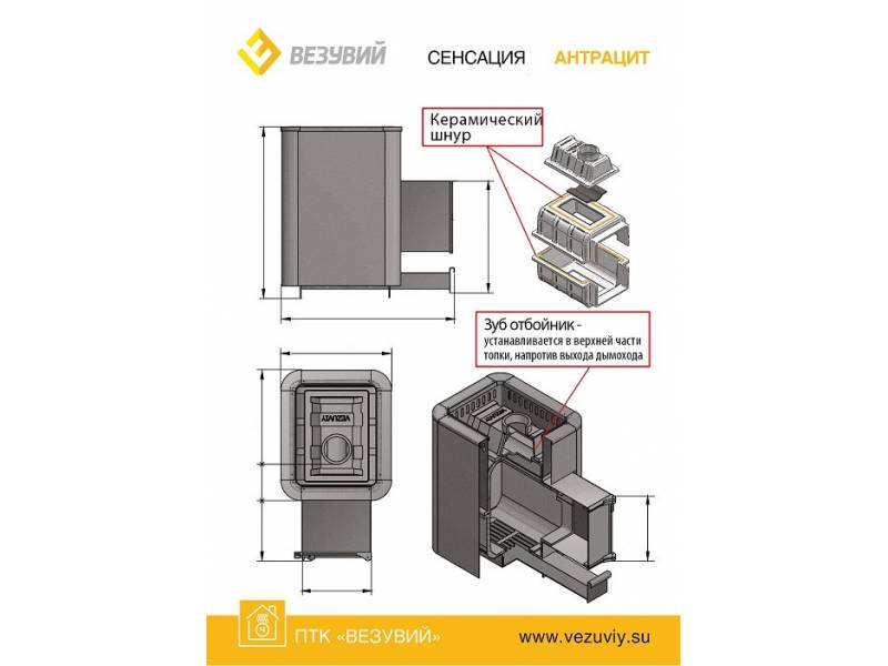 Преимущество печи в том, что топка печи состоит из 3-х элементов. На стыке между ними используется керамический шнур с рабочей температурой 1200 градусов. То есть топка печи абсолютно герметична! Для фиксации деталей между собой применяется болтовое соединение, что даёт 100% гарантию безопасности при эксплуатации.