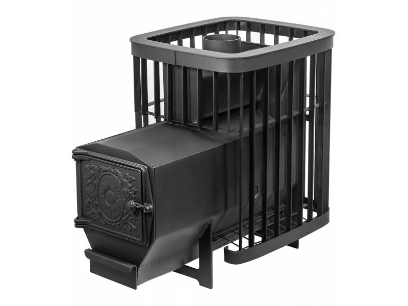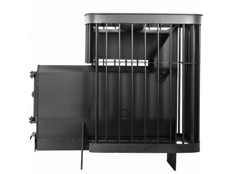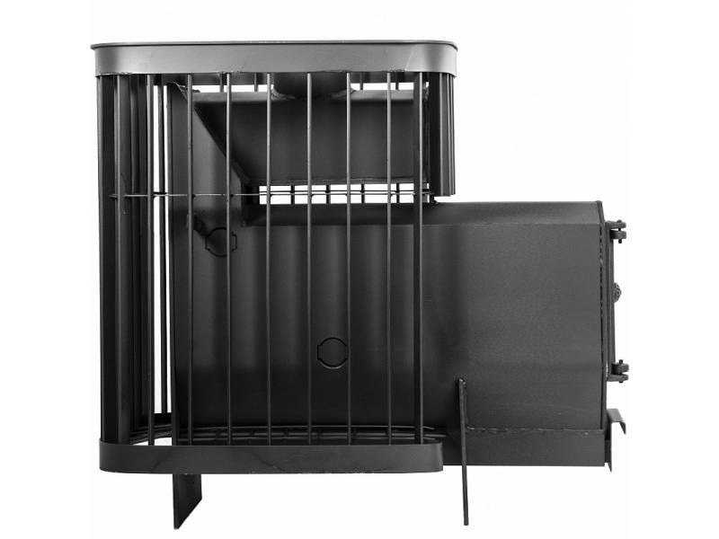 Топка и зольный ящик изготовлены из стального проката, усиленные в участках подверженных наибольшей деформации гибкой. Рядом с отсеком для закладки камня находится патрубок для подключения дымохода.