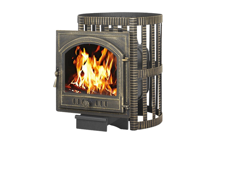 Печь укомплектована чугунной каминной герметичной, самоохлаждаемой дверцей посадочный размер у которой 410х410 мм, с большим жаропрочным стеклом «SHOTROBAX», с оборудованной системой самоочистки и кованным ковнвекционно-вентилируемым кожухом. В конструкции данной печи предусмотрен топочный тоннель длиной 250 мм, при помощи которого печь топится из соседнего помещения, смежного с парильным.
