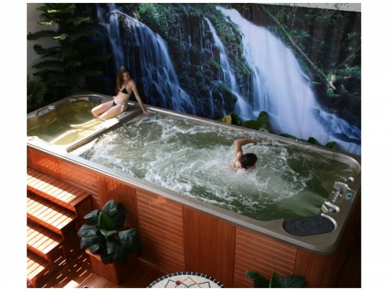 Гидромассажный комплекс у Вас дома, включает в себя одно лежачее кресло и два сидячих и большую вместительную зону для плавания с удобным спуском.