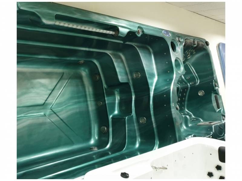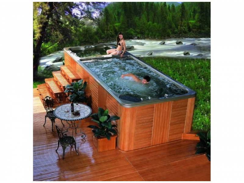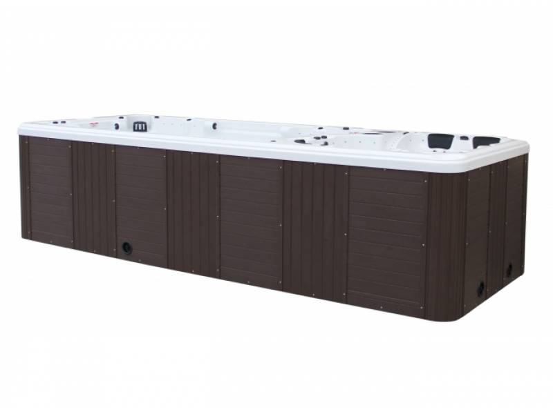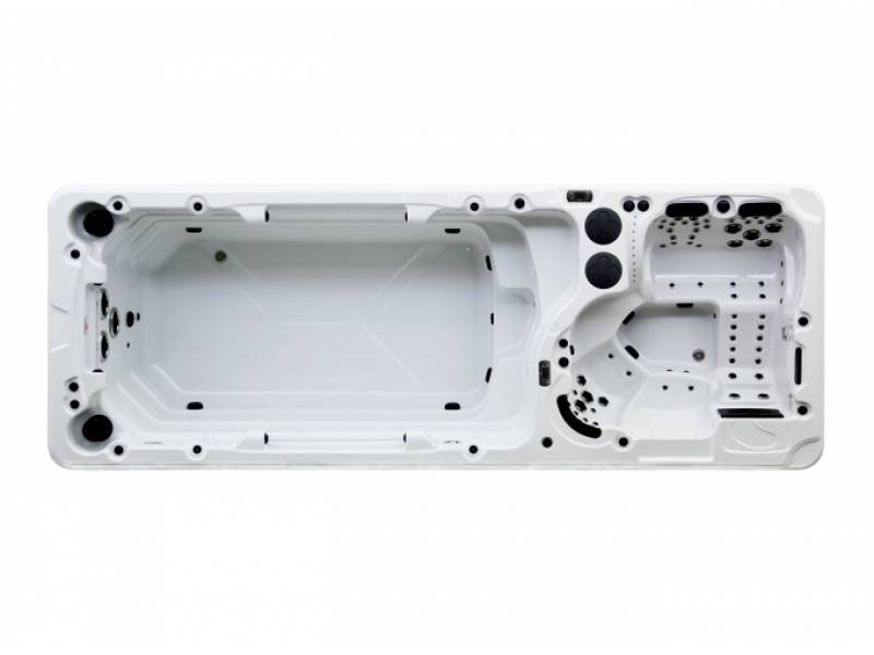 Это профессиональный спа бассейн для плавания. В зоне для плавания установлены мощные форсунки противотока. За каждую форсунку отвечает один насос мощностью 3л.с. Сила напора воды и направление потока воды регулируется. В этом спа бассейне может тренироваться профессиональный плавец за счет регулировки мощности потока воды. На боковых стенках установлены два поручня для выполнения аэробных упражнений в воде. В зоне гидромассажаиспользуются 3 кресла сидячих и одно лежачее.
