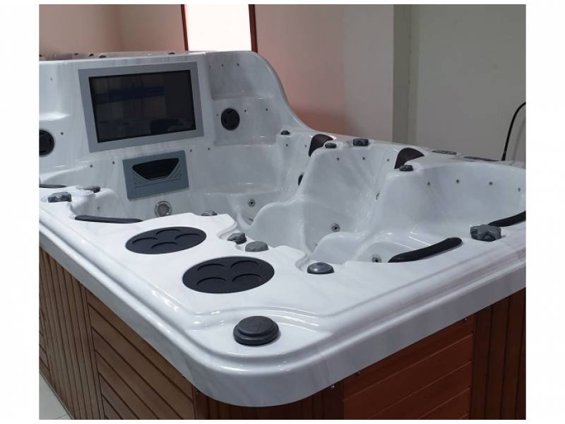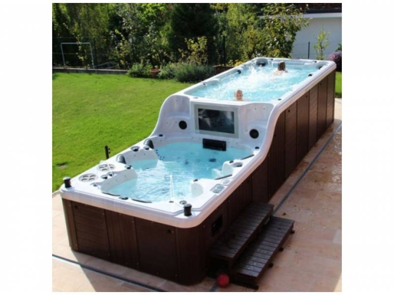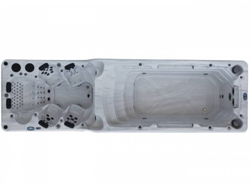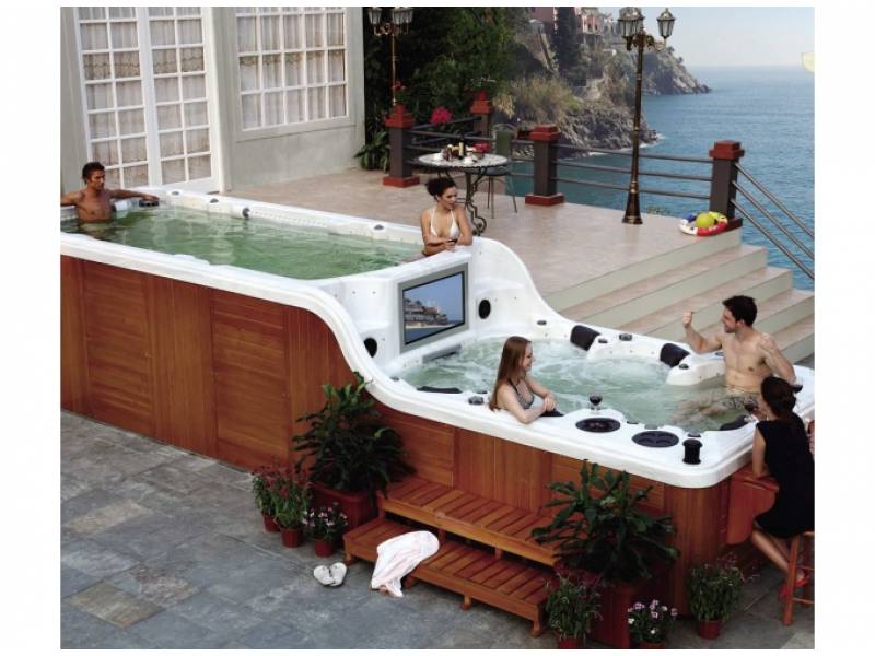 Совершенно новый плавательный спа бассейн с неповторимым дизайном. Сочетает в себе бесконечный бассейн глубиной 148 см и роскошную гидромассажную зону на 6 человек. с 32-дюймовым ЖК-телевизором, DVD-плеером, стереосистемой с динамиками. В зоне для плавания установлены мощные форсунки противотока. За каждую форсунку отвечает один насос мощностью 3л.с. Сила напора воды и направление потока.